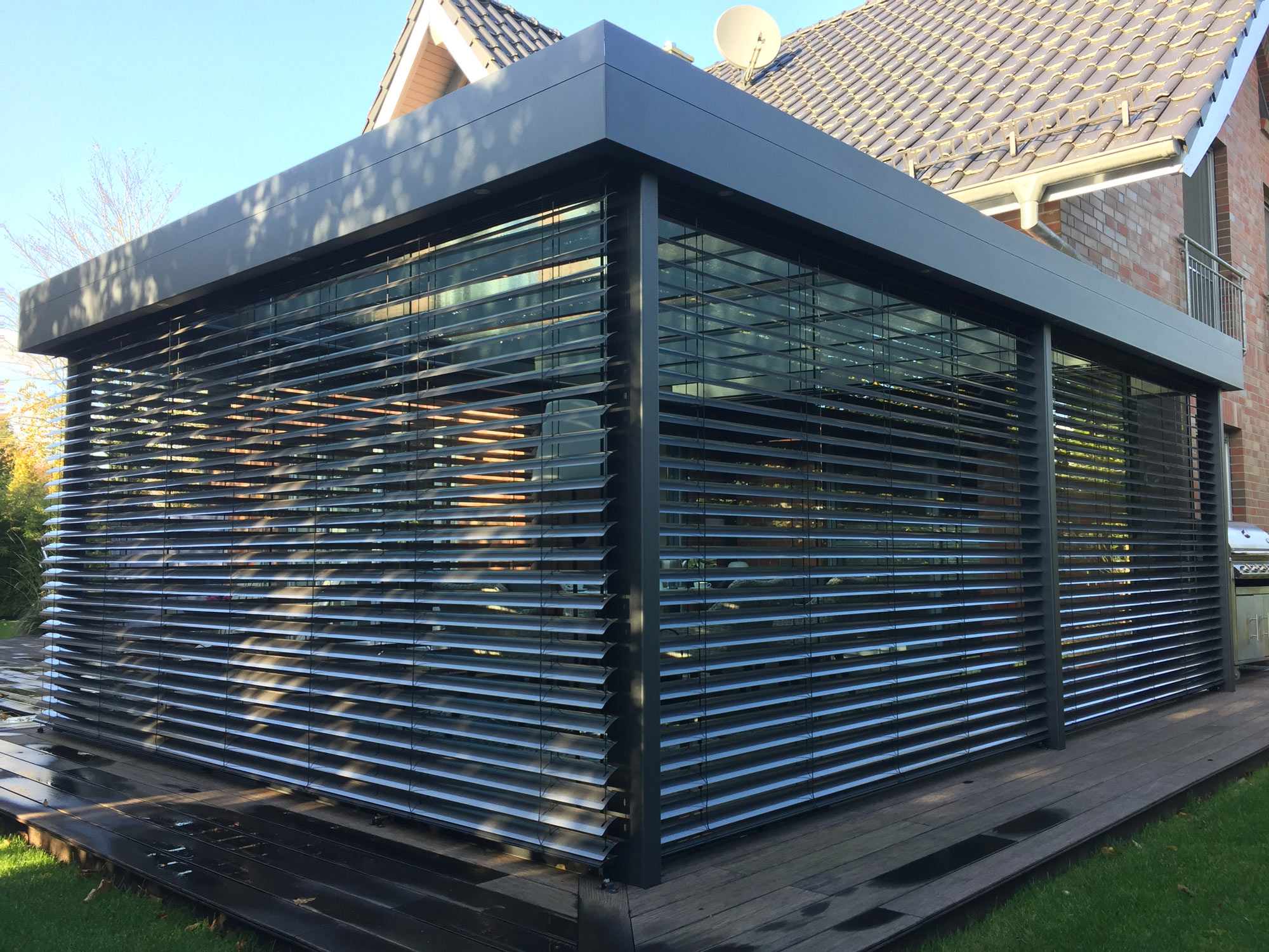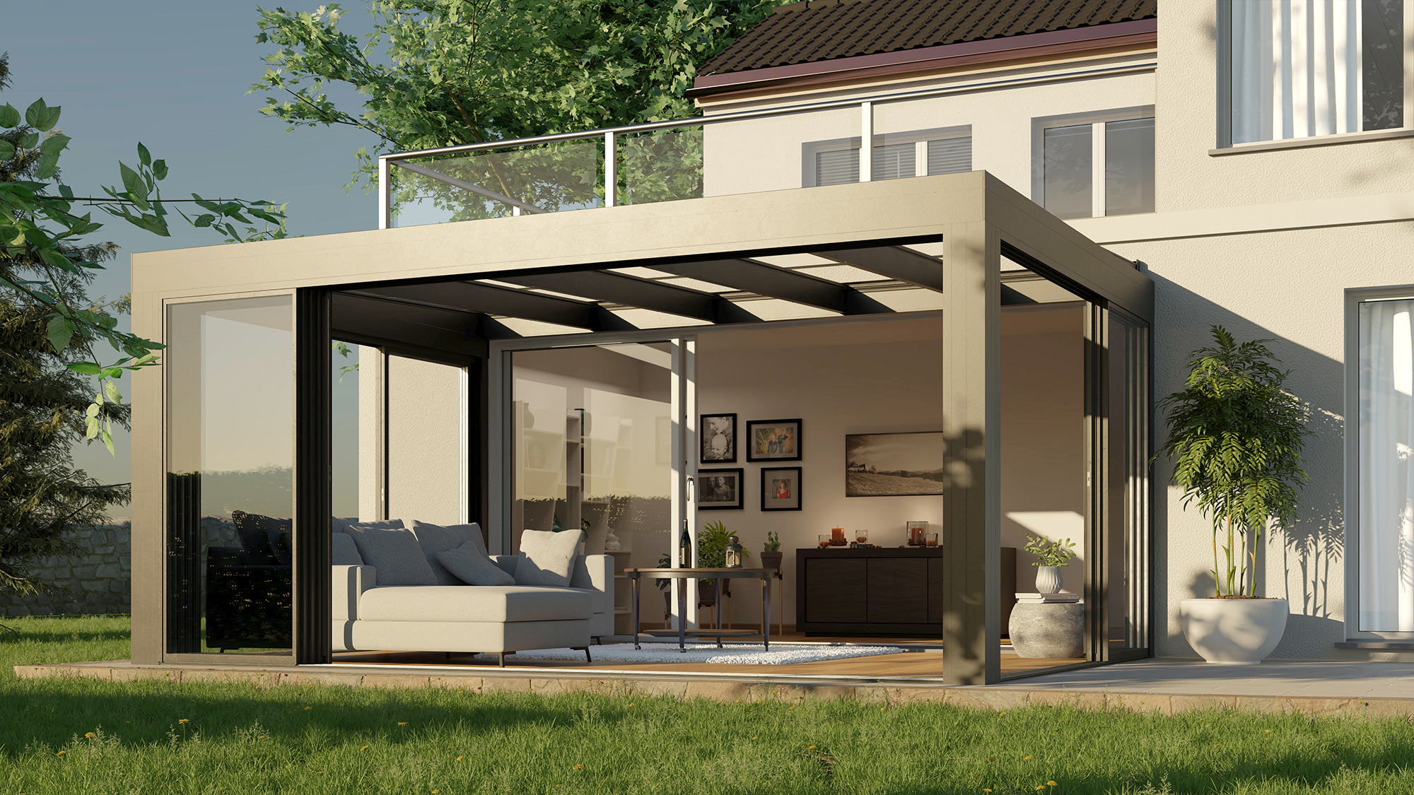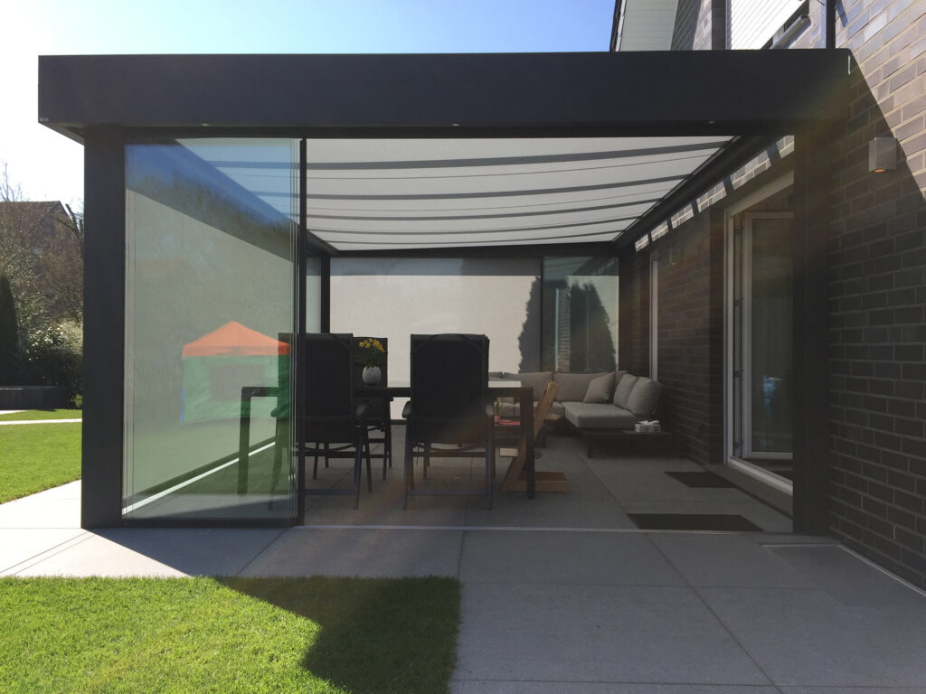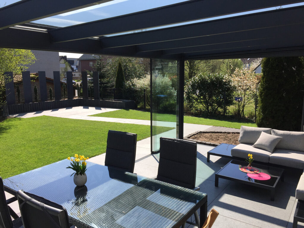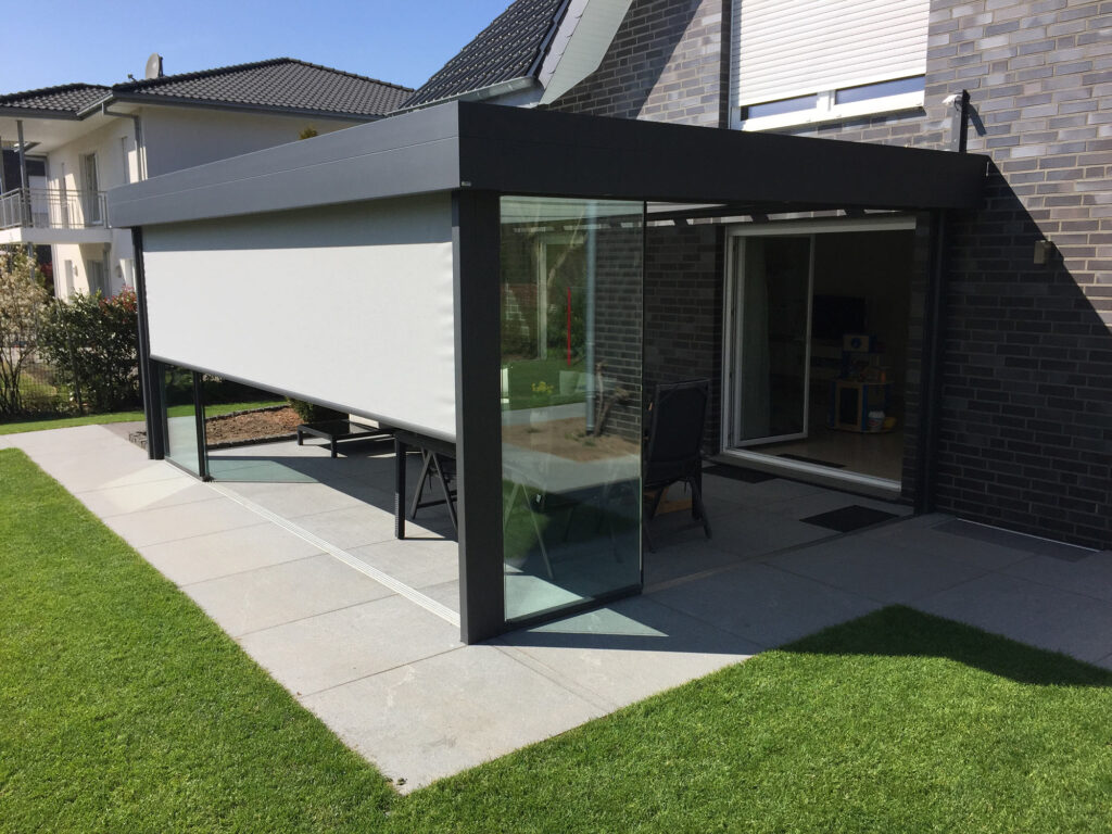 Ob offen und luftig oder rundum geschützt: Unsere hochwertigen Terrassendächer aus Aluminiumprofilen sind durch seitliche feste Verglasung oder mit Schiebeelementen erweiterbar.